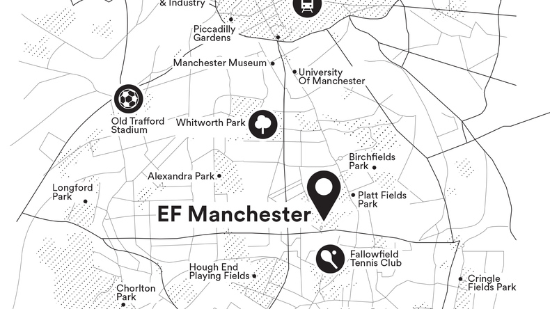 Localização: EF International Language Center Manchester está localizada na cidade industrial e vibrante de Manchester, Inglaterra. A escola está localizada em um fantástico prédio estadual vitoriano, bem no coração do ponto quente estudantil da área de Fallowfield. Ao redor da EF Manchester há parques, universidades, lojas, restaurantes e muita diversão, garantindo que o tempo do aluno dentro e fora da sala de aula seja ao mesmo tempo excitante e informativo. A uma curta viagem de 30 minutos do centro da cidade, os alunos da escola estão em uma posição excelente, 5km fora do centro da cidade, para aproveitar Manchester e tudo o que ela tem a oferecer. O aeroporto internacional de Manchester está a cerca de 60 minutos de viagem da escola via transporte público.
