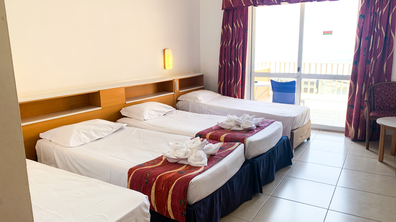 Quartos climatizados com banheira e chuveiro, telefone e varanda com vista para o mar. Os quartos são partilhados entre 3-4 crianças da mesma idade.